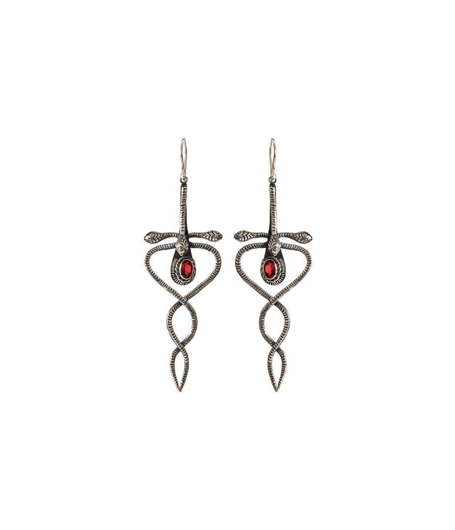 Ασημένια σκουλαρίκια εμπνευσμένα από το κηρύκειο σύμβολο, ένα αρχαίο σύμβολο που συνδέεται με τον Θεό Ερμή. Στο κέντρο η ημιπολύτιμη πέτρα γρανάδα σε μια πολυεδρική κοπή, που πιστεύεται ότι ενθαρρύνει το αίσθημα της δύναμης, του πάθους και της αφθονίας.