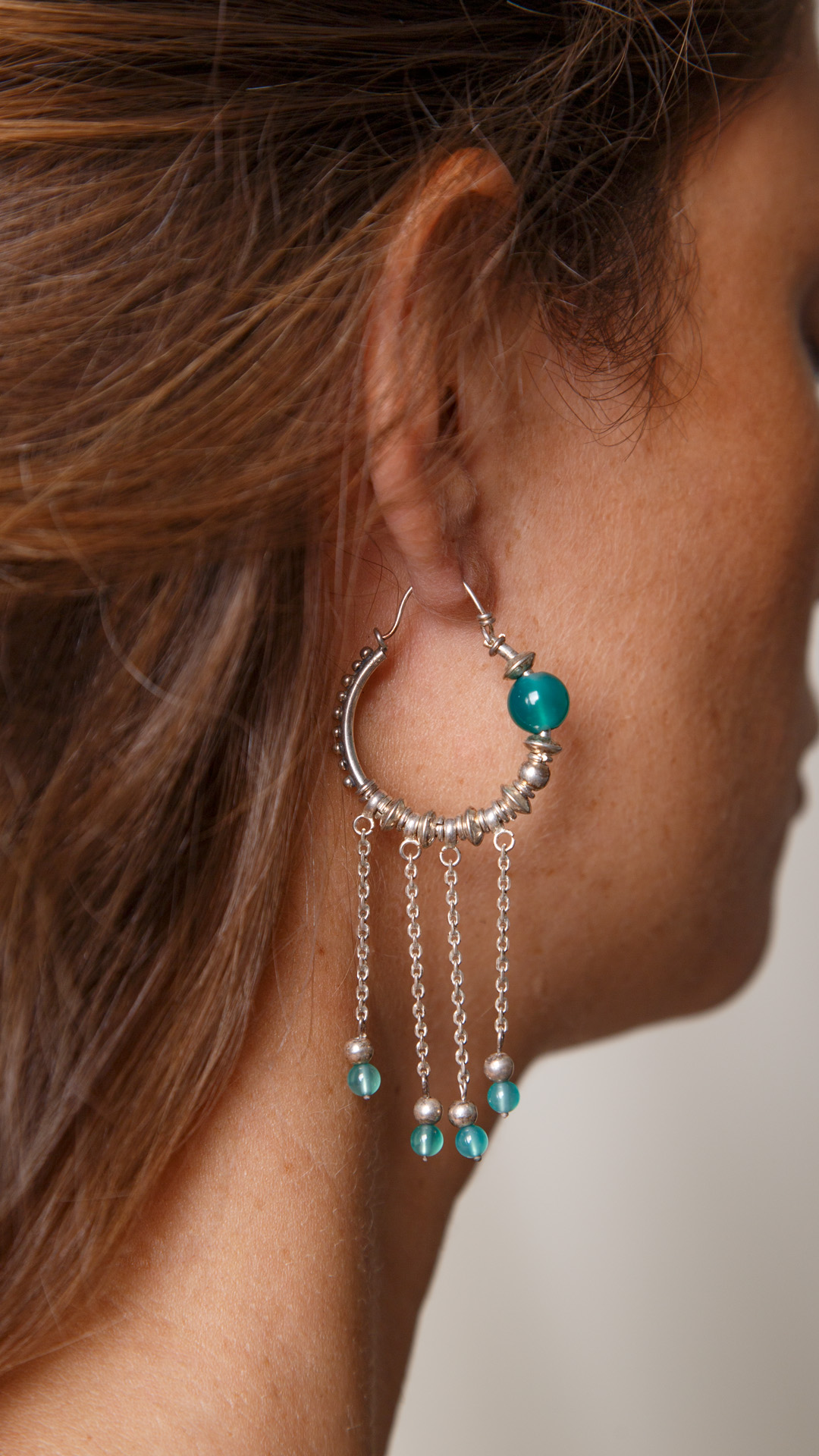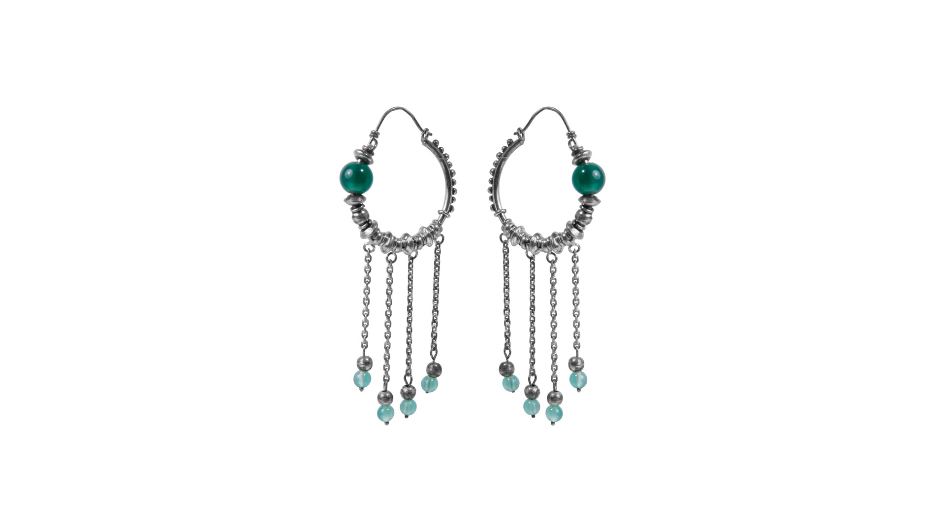 Ένα κόσμημα γεμάτο κίνηση! Όπως υποδηλώνει το όνομά τους, αυτά τα ασημένια σκουλαρίκια αποτελούνται από μικρές ασημένιες αλυσίδες, ακολουθούν την κίνηση σας και δημιουργούν μια παιχνιδιάρικη αίσθηση. Διακοσμημένο με την τεχνική κοκκοποίησης και με την ημιπολύτιμη πέτρα Πράσινος ‘Όνυχας αποτελεί μια μοναδική επιλογή.