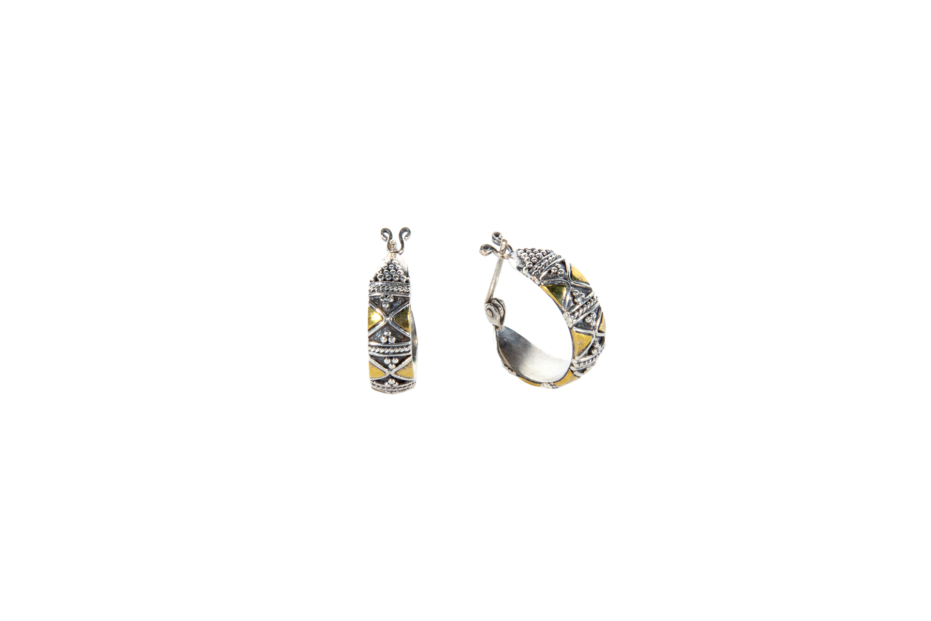 Ασημένια σκουλαρίκια που συνδυάζουν ασήμι και μπρούτζο με ένα περίτεχνο τρόπο. Το κόσμημα είναι διακοσμημένο με την τεχνική κοκκοποίησης δημιουργώντας όμορφα σχέδια σε όλη την επιφάνεια του. Για μια ολοκληρωμένη εμφάνιση, συνδυάστε το με το Kardamila Silver and Bronge Ring.