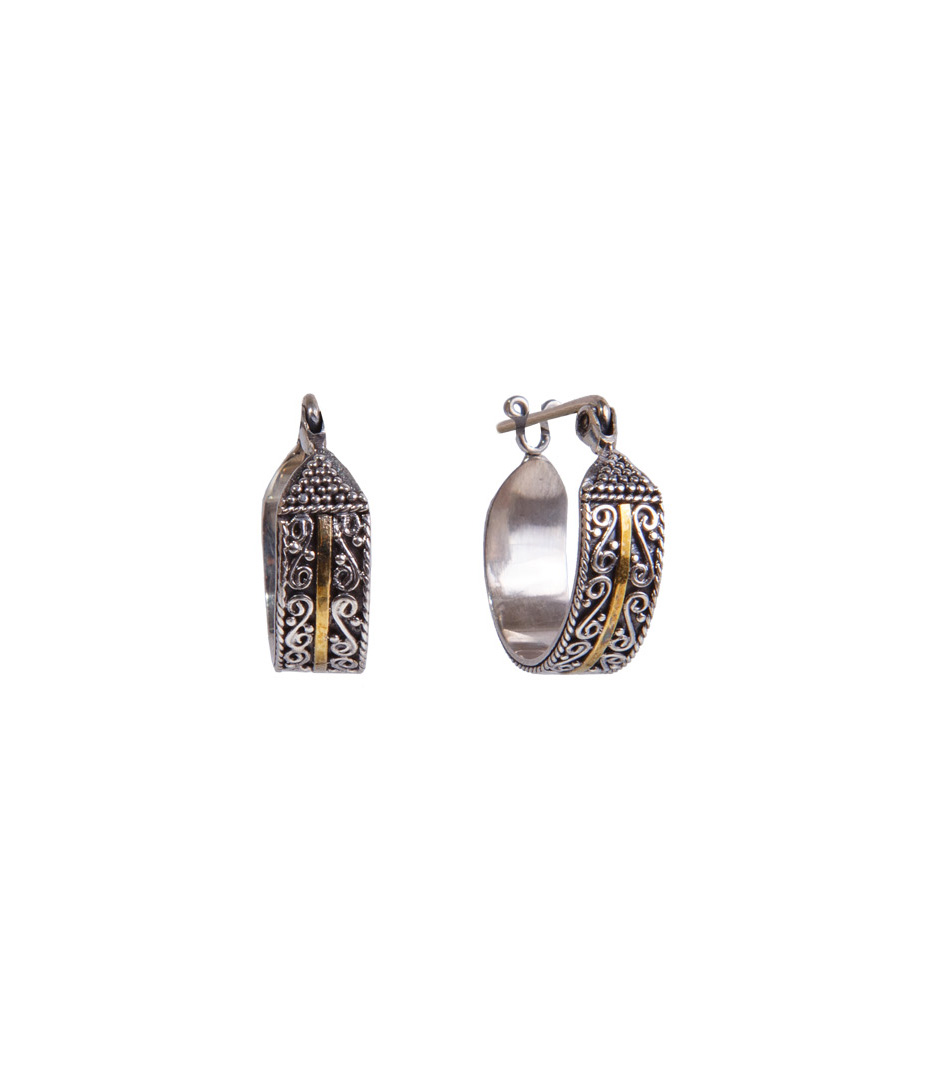 Ασημένια σκουλαρίκια που συνδυάζουν ασήμι και μπρούτζο . Το κόσμημα είναι διακοσμημένο με. με ένα περίτεχνο τρόπο την τεχνική κοκκοποίησης δημιουργώντας όμορφα σχέδια σε όλη την επιφάνεια του.Για μια ολοκληρωμένη εμφάνιση, συνδυάστε το με το Kardamila Silver and Bronge Ring.