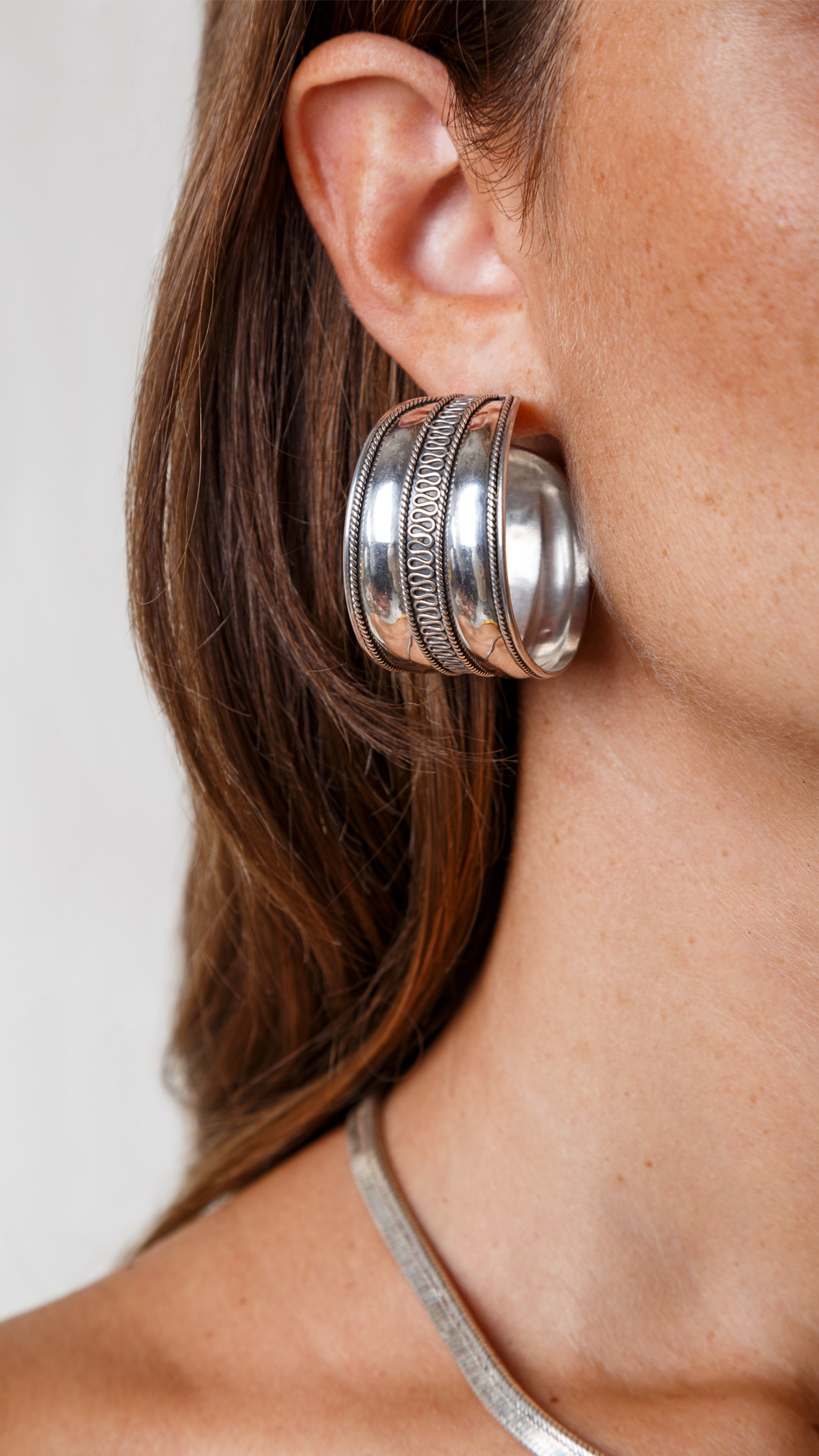 Ένα συναρπαστικό ζευγάρι κρίκων με λεπτομερή διακόσμηση από ασημένια πλέξη στο κέντρο. Ένα μοναδικό κομμάτι που εντυπωσιάζει με τη πρώτη ματιά λόγω της λάμψης του αλλά και του μοναδικού του design.